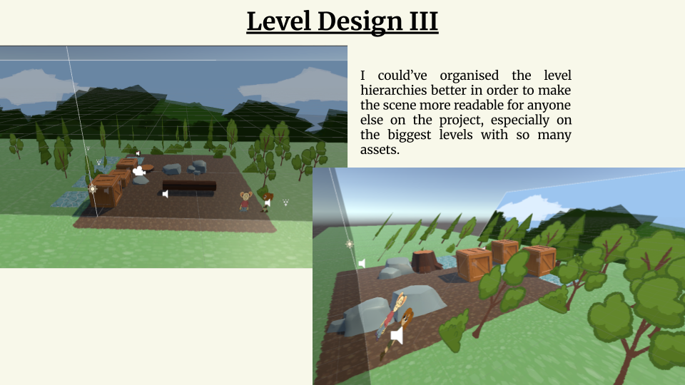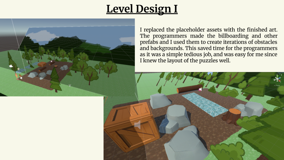 For this project I worked alongside another game designer, two game artists, and two programmers. I was responsible for group management, documentation & planning, Unity level design and 3d assets/ technical art elements.